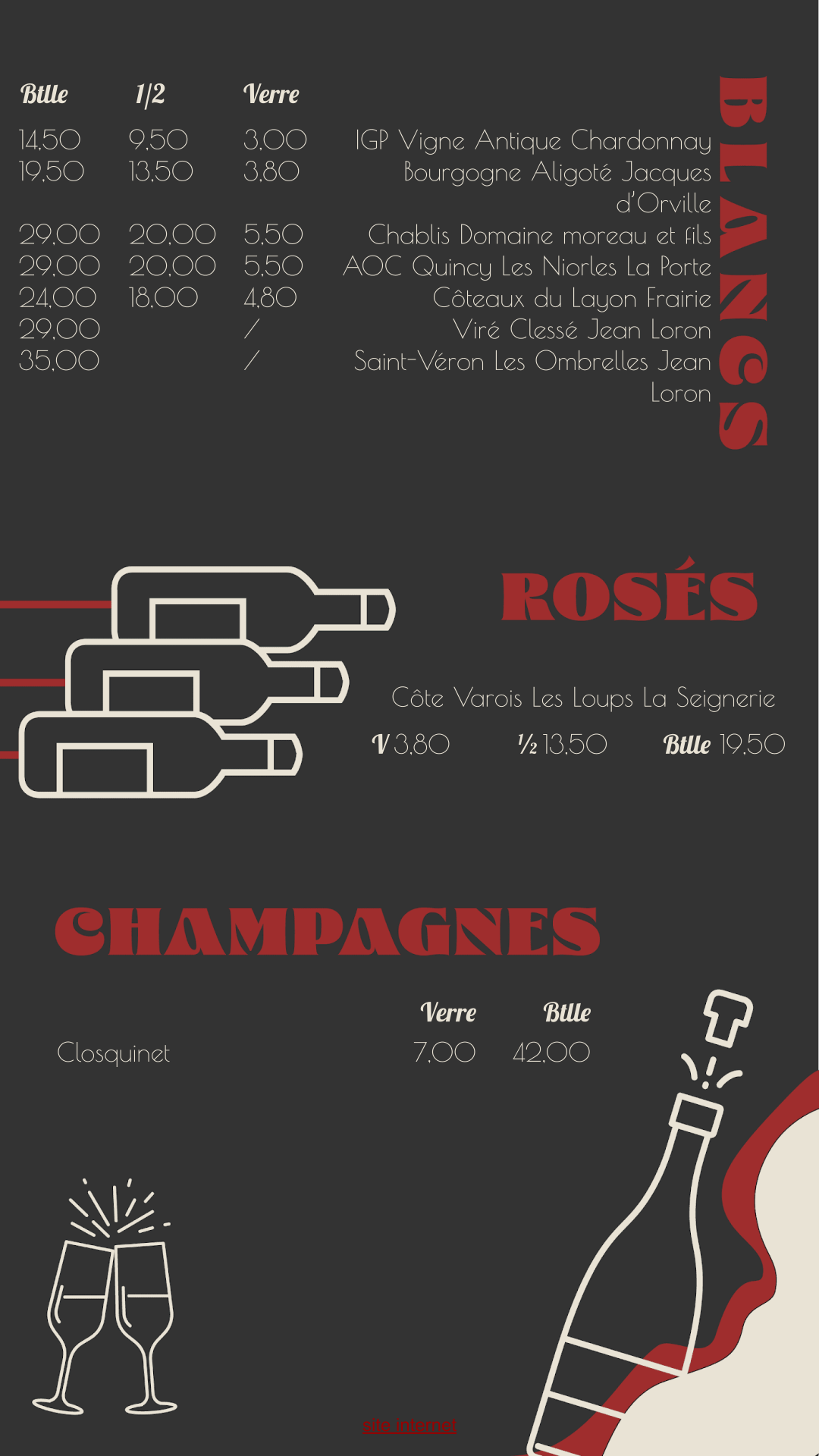 Pour accompagner vos plats, notre sommelier, Pierre, se fera un plaisir de vous sélectionner un vin idéalement adapté aux saveurs de votre plat. N'hésitez pas à lui demander une dégustation au verre :-)